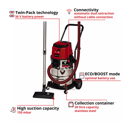 Einhell TP-VC 36/30 S Auto-Solo PXC 36V Professional 30L Stainless Steel Wet/Dry Vac Kit (2x 5.2Ah & PXC Charger) 2347143