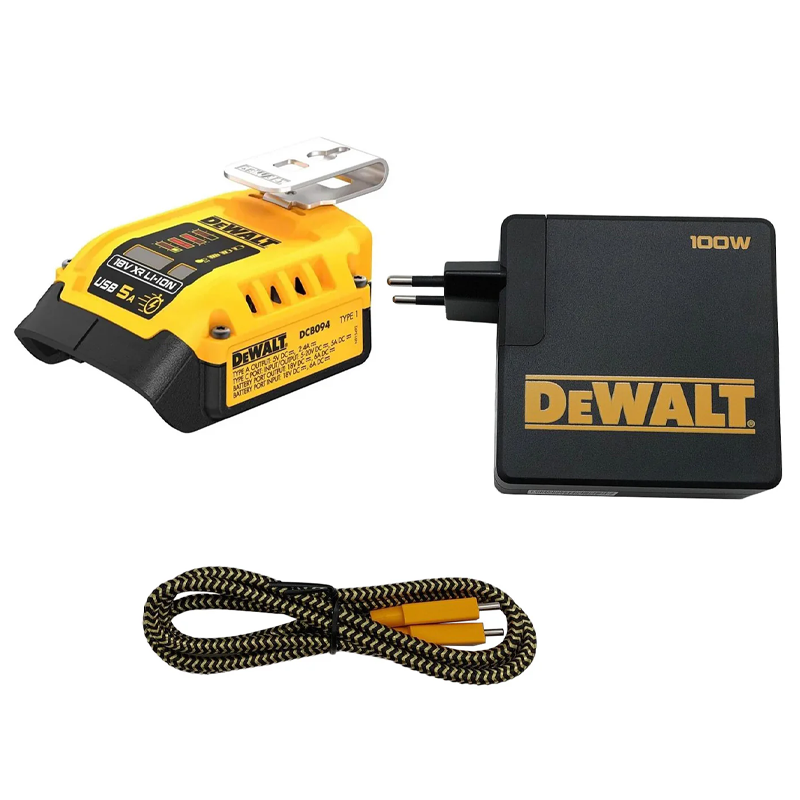 With this USB Charging Kit, you can easily charge your compatible devices and accessories. With this Charging Kit, you can quickly charge DEWALT® 18V MAX* and FLEXVOLT® battery packs "s 100 W bi-directional USB-C port and output power to charge other personal devices up to 100 W. The quick charger "The USB-A port functions as an adapter, allowing you to charge devices up to 12 W with standard USB cords. Our DCB094 USB Charger, a 100 W USB cord, a 65 W power supply, and a belt hook for on-the-go storage are all included in this kit.