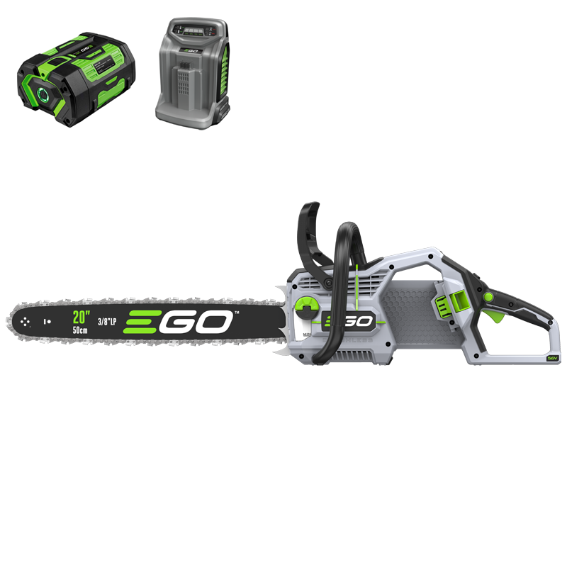 The EGO POWER+ 20” Chain Saw provides the performance and strength comparable to a 55cc gas chainsaw but without the inconvenience of noise, hassle, or emissions. Utilizing any EGO POWER+ 56V ARC Lithium™ battery, this cordless chainsaw can achieve up to 230 cuts on a 4x4 with the included 6.0Ah ARC Lithium™ battery. Its 20-inch bar and chain are specifically engineered for tackling substantial branches, stumps, and tall trees, while its efficient brushless motor ensures chain speeds of up to 25 m/s for precise, effective cuts. You can manage speed select modes and monitor battery charge status through the digital display. The electric chainsaw boasts an omnidirectional auto chain brake sensor that activates to halt the chain from various tool orientations, complementing the kickback brake. Additionally, a powerful LED work light located at the front of the chainsaw enhances visibility during dusk or emergencies when lighting is limited. Discover unparalleled power with the EGO POWER+ 20” Chain Saw.