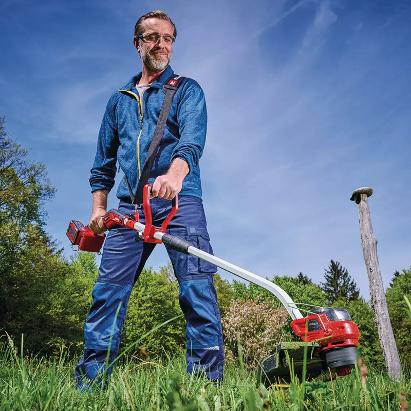 With the Einhell Professional cordless lawn trimmer GP-CT 36/35 Li BL-Solo, every gardener has a practical and proven helper in the tool shed. Whether trimming edge strips or shaping the lawn, the cordless lawn trimmer works quickly and powerfully thanks to 2-stage speed control. It is a member of the Power X-Change family. The batteries can be used in all devices in this system series. 2x 18V batteries are required to operate the cordless lawn trimmer. The device is powered by the Einhell PurePOWER brushless motor. This brushless motor offers more power and longer running time than conventional carbon brush motors. After online registration, there is a 10-year warranty on the brushless motor. The double-bent aluminium guide bar ensures the perfect balance when working.