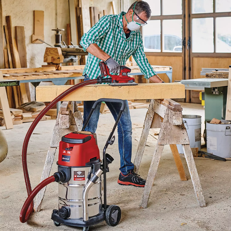 The sturdy, stainless steel container holds up to 30 litres. Dirty water can easily be drained via the handy water drain plug. The blow-out connection is used for blowing out hard-to-reach places, e. g. corners or spaces behind radiators. Large wheels and rollers make for mobility and easy transport. The wet/dry vacuum cleaner can be connected to various Einhell devices for extraction. With its connectivity function, dust extraction is carried out without a cable connection. Via the transmitter mounted on the suction hose detecting the vibrations of the connected device, the vacuum cleaner starts and stops automatically when the cordless tool is started/stopped.