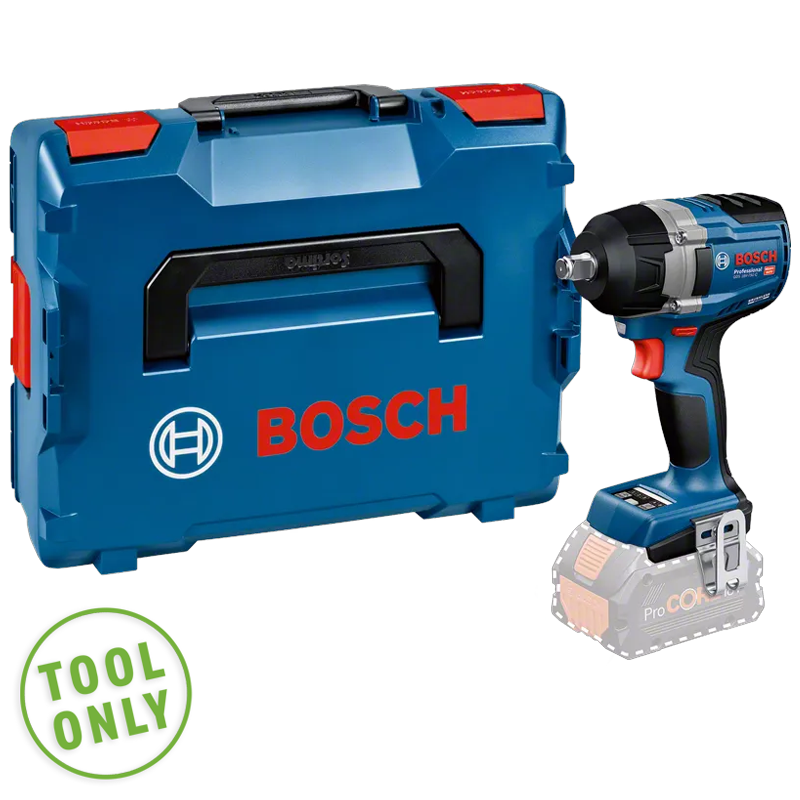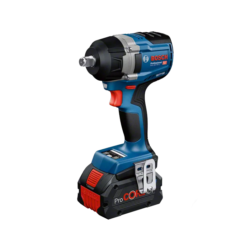 The impact wrench is ideal for metal workshops/locksmiths, industrial metal fabrication and vehicle maintenance using metal bolts/nuts from M12 to M22. It covers a wide range of concrete screws up to 16mm for applications in general construction and is also suitable for wood screws. Compatible with the Bosch Professional 18V System and with the multi-brand battery alliance AMPShare. Comes with two LED lights to ensure best-in-class workplace illumination. The impact wrench also has a status indicator and a belt clip for increased convenience.
