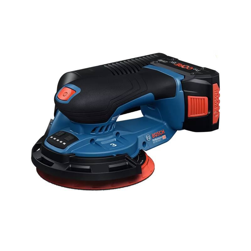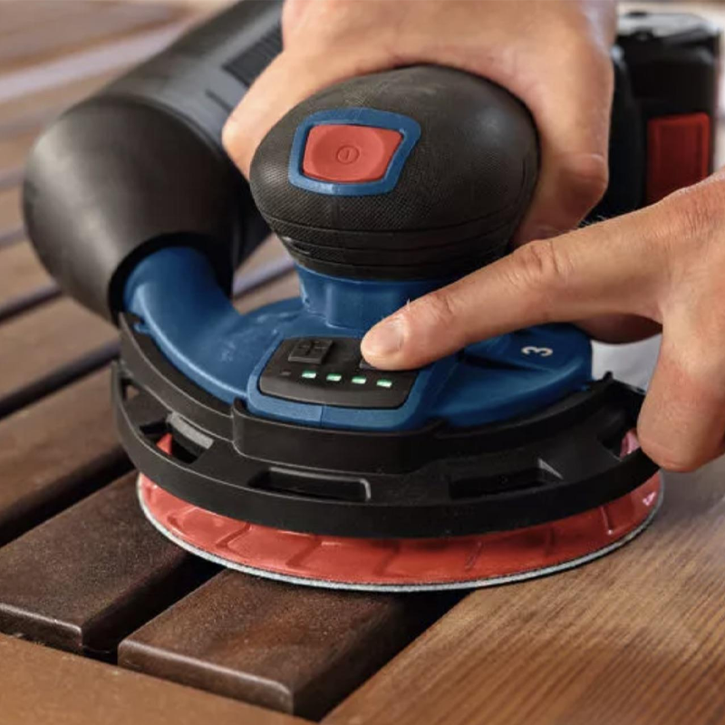 The GEX 18V-150-3 Professional random orbit sander’s outstanding balance and gripping area close to the workpiece offers optimal control in all working positions. Its excellent ergonomics make it easy to use with one or two hands for less-fatigue sanding over a longer period. This sander is extremely efficient with high removal rates thanks to its brushless motor and 3 mm orbit. Plus, there’s significantly less dust with the pad’s integrated Venturi Air Channels and the innovative dust box with integrated Click&Clean interface. Thanks to the HMI, operation is very simple and intuitive. The GEX 18V-150-3 Professional is ideal for removing wood, paint and lacquer as well as intermediate sanding and fine sanding of surfaces. It is compatible with all 18V batteries, ideally ProCORE18V 4.0Ah for a perfect balance. The GEX 18V-150-3 Professional features a dust box, speed selection, battery status indication and guard ring as well as 150 mm sanding pad.