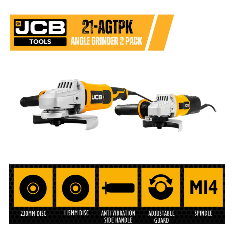 Discover the power of the JCB Angle Grinder Twin Pack, a dynamic duo of 115mm and 230mm Angle Grinders, thoughtfully designed to tackle a wide range of tasks, making it ideal for professional and serious DIY projects.