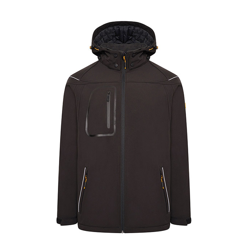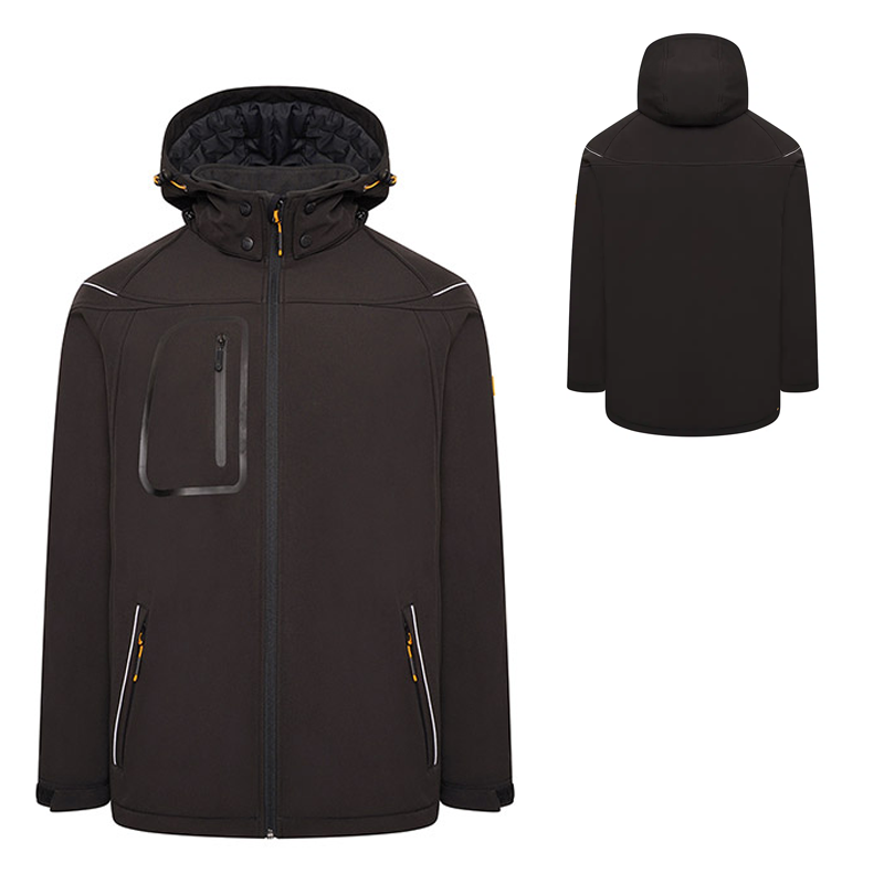 The heavyweight softshell jacket provides warmth and comfort. Worn two ways, with or without a hood which is detachable. Underarm zips allow breathability when working through the day. To allow movement when working the fabric composition contains 8% spandex to accommodate 4 way movement. Fleece lined inner for warmth. Side zipped pockets and adjustable cuffs for practicallity with additional multi-functional inner pockets. Find your perfect comfort and fit by adjusting the bottom hem drawcord and cuffs.