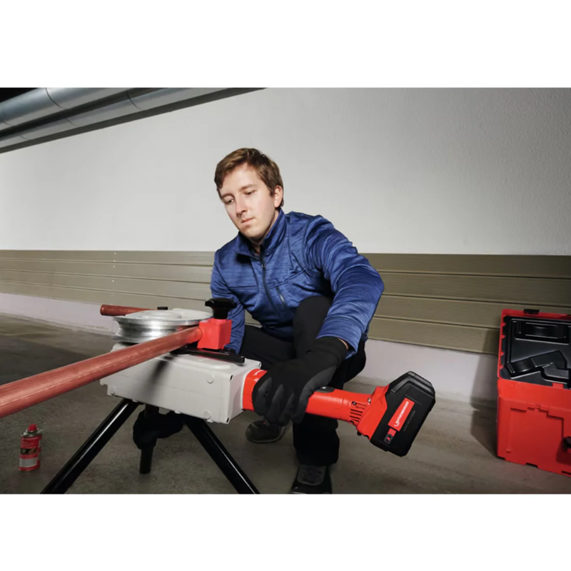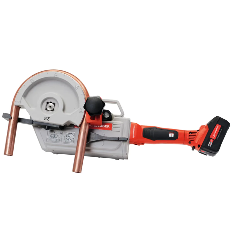 The ROBEND 4000 E bending machine is suitable for bending copper, stainless steel and carbon steel pipes in the dimensions 12-35 mm (1/2-1.3/8 inch) with a maximum bending radius of 180°. The brushless motor ensures a longer service life and less wear and tear on the machine. The tool-free pre-setting of the bending angle and the automatic switch-off when the desired bending angle is reached make the ROBEND 4000 E perfect for series production. Deformation- and crease-free bending is guaranteed by the patented ROLUB technology. 60 bends are possible with the 18 V battery. Faster and more precise work is guaranteed by the simple handling.