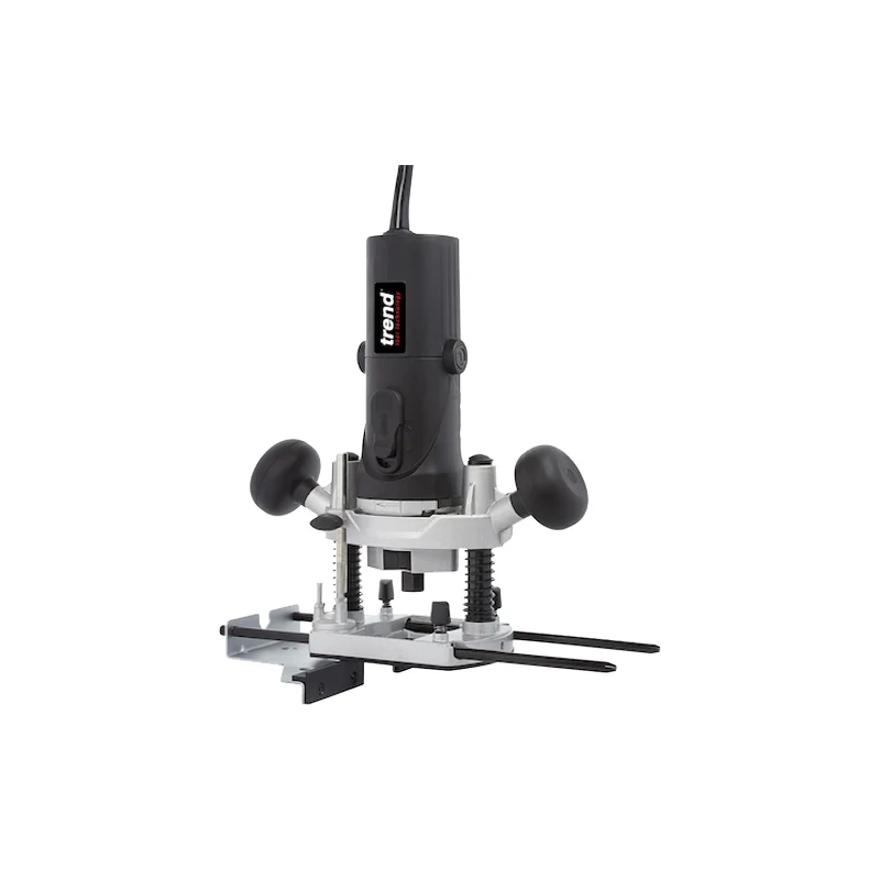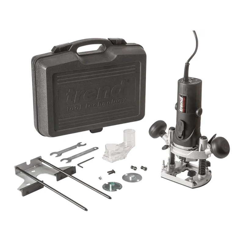 The router is equipped with tapped fixing holes for Trend standard guide bushes, separate dust spout fixing holes, and an adjustable twin rod side fence for guiding along a straight edge. These features ensure accuracy and precision in every cut, making your woodworking tasks easier and more enjoyable.